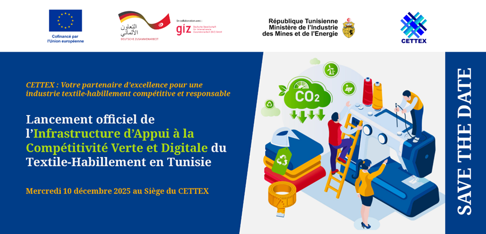 Le Centre Technique du Textile (CETTEX) a le plaisir d'annoncer la tenue de la cérémonie officielle de lancement de la nouvelle Infrastructure d’Appui à la Compétitivité Verte et Digitale du secteur Textile-Habillement en Tunisie qui se tiendra le Mercredi 10 décembre 2025 au siège du CETTEX à Ben Arous.