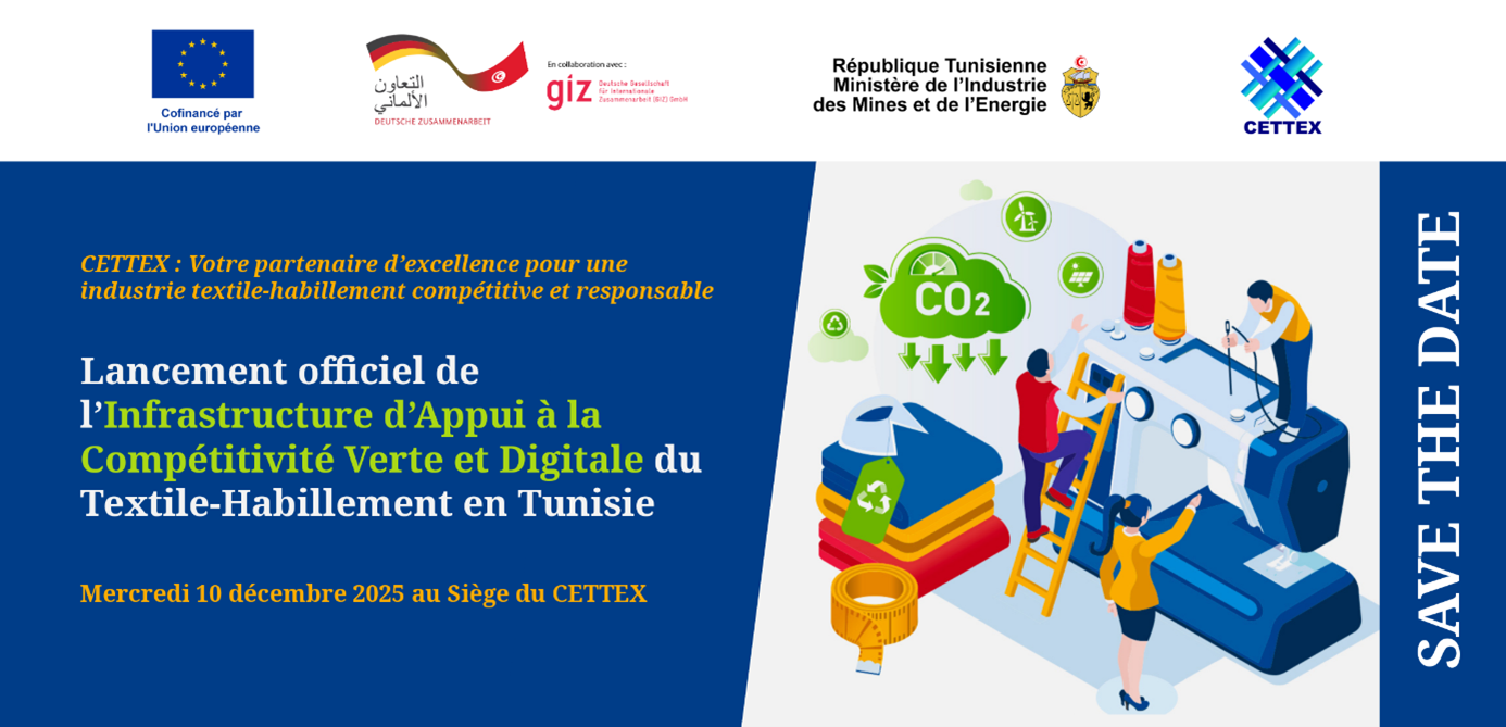 Le Centre Technique du Textile (CETTEX) a le plaisir d'annoncer la tenue de la cérémonie officielle de lancement de la nouvelle Infrastructure d’Appui à la Compétitivité Verte et Digitale du secteur Textile-Habillement en Tunisie qui se tiendra le Mercredi 10 décembre 2025 au siège du CETTEX à Ben
